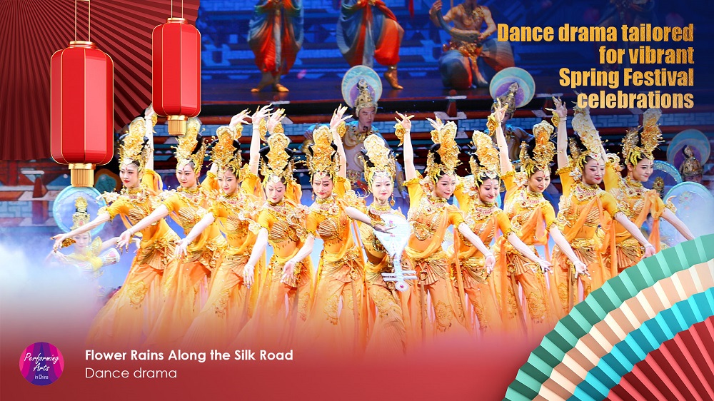 The classic dance drama Flower Rains Along the Silk Road is based on the Dunhuang murals and Silk Road, with the theme of peace and friendship. It portrays Dunhuang painter Shen Bizhang and his daughter, Yingniang, and their friendship with a Persian merchant. It vividly presents the extensive and profound Dunhuang culture in an artistic style.