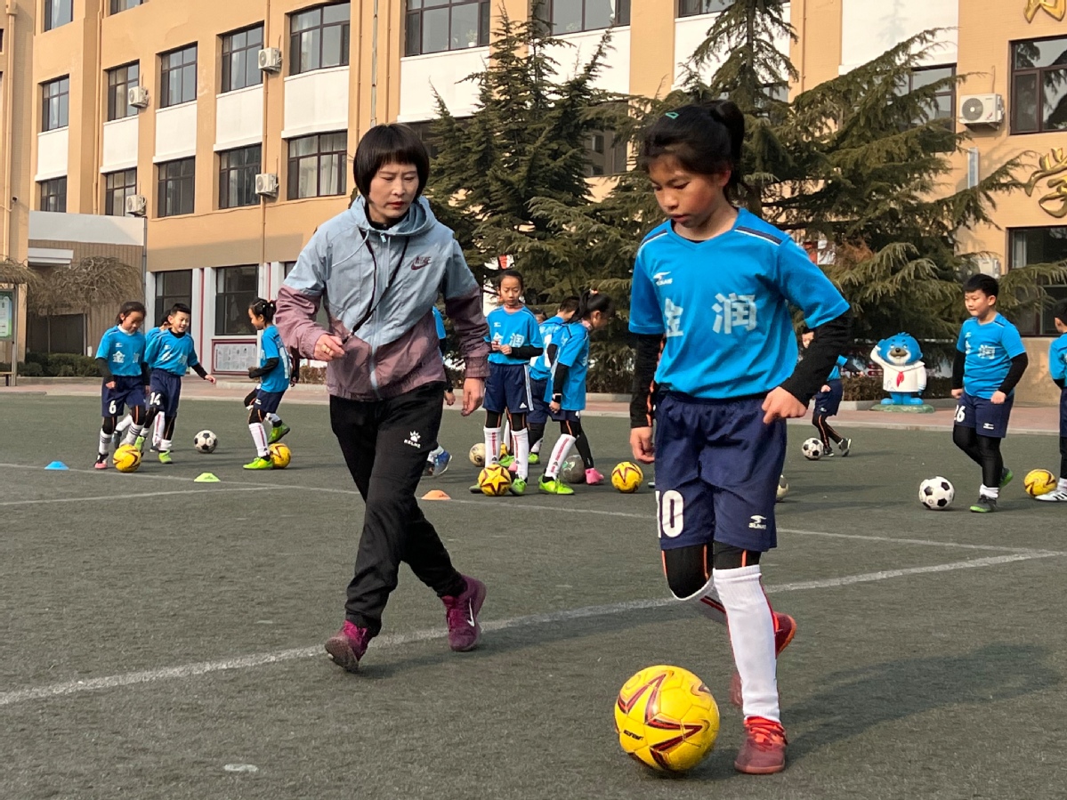 In this picture taken on Feb 11, 2022, students of Jinrun primary school attend a soccer training session at their school in Jinpu New Area of Dalian, Liaoning province. [Photo by Xi Bolong/for chinadaily.com.cn]