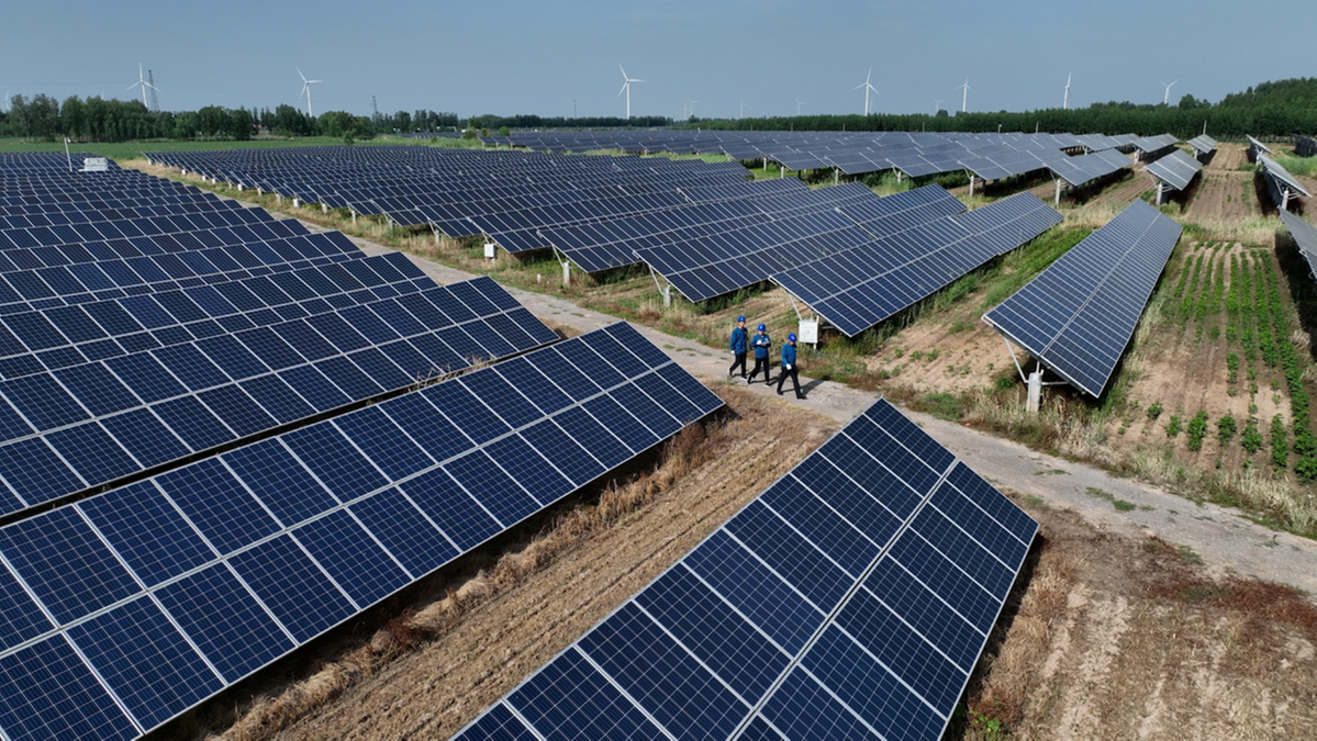 Technicians of State Grid Dezhou Lingcheng Power Supply Co check PV panels at a solar power plant in Dezhou, Shandong province. [Photo provided to China Daily]