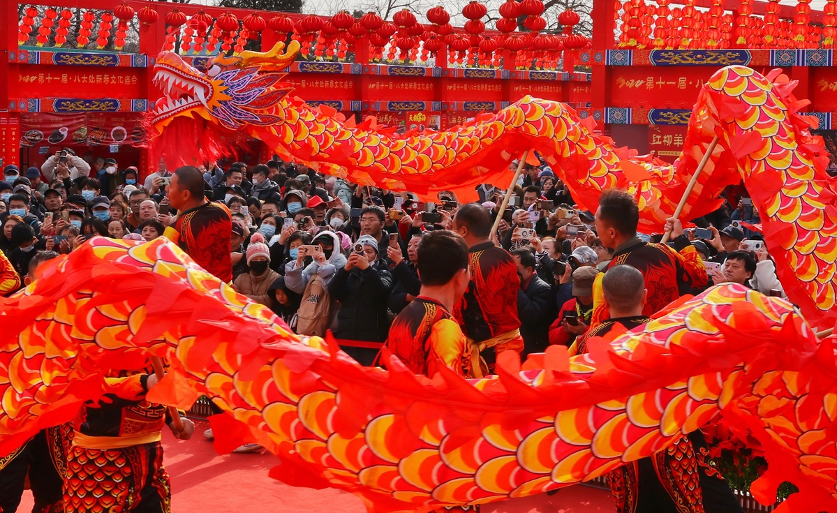 Tourists watch a dragon dance at the Spring Festival temple fair held at Badachu Park in Beijing on Feb 14, 2024. [Photo by Jiang Dong/chinadaily.com.cn]