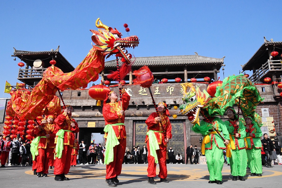 People perform dragon dances at a scenic area in Guangping county, Handan, North China's Hebei province, Feb 12, 2024. [Photo by Cheng Xuehu/chinadaily.com.cn]