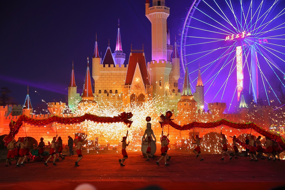Dragon dancers perform at Shijingshan Amusement Park in Beijing on Feb 13, 2024. [Photo by Jiang Dong/chinadaily.com.cn]
