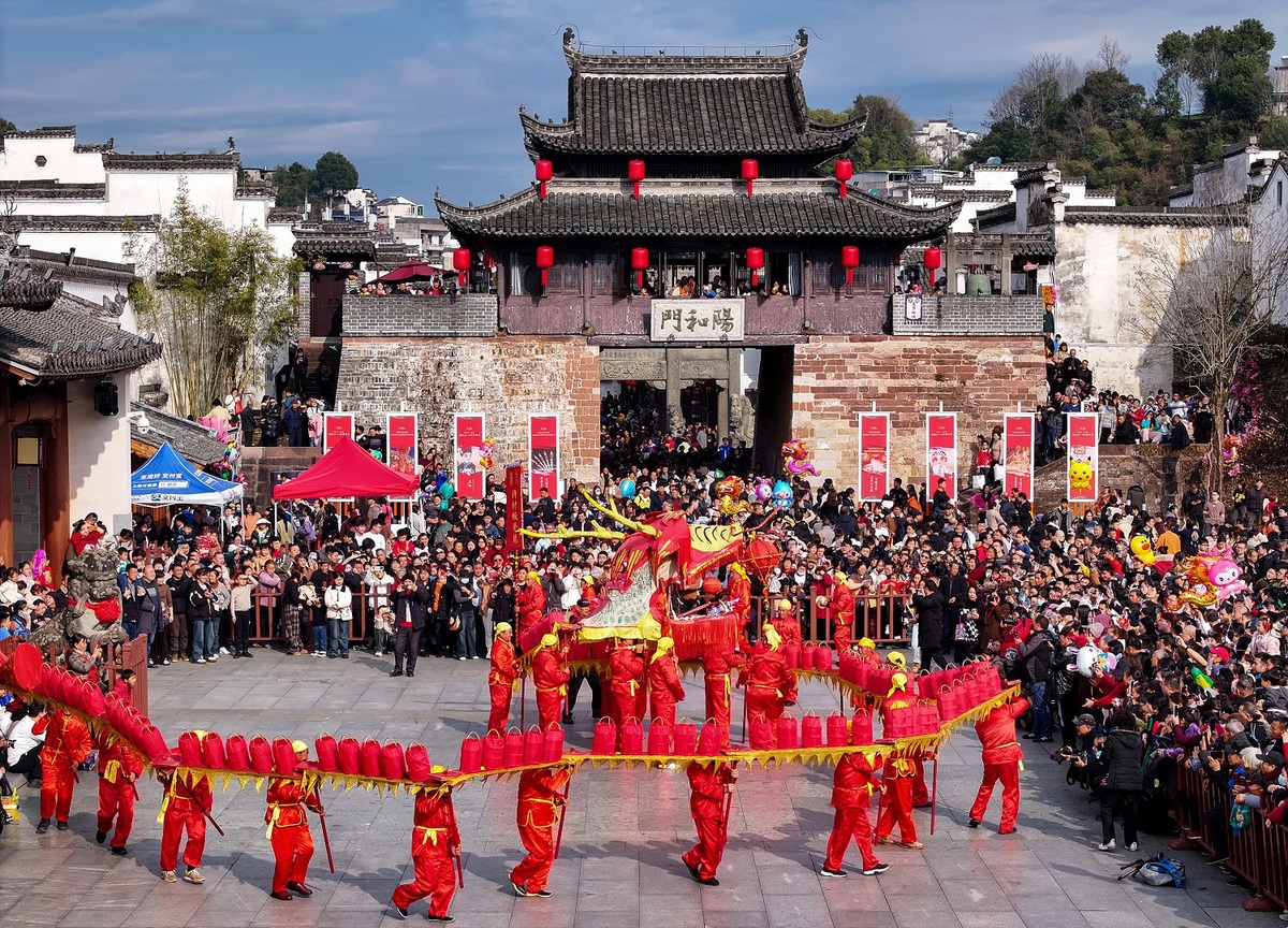 A drone photo shows the dragon dance at Huizhou ancient city in Huangshan, East China's Anhui province on Feb 13, 2024. [Photo by Shi Yalei/chinadaily.com.cn]