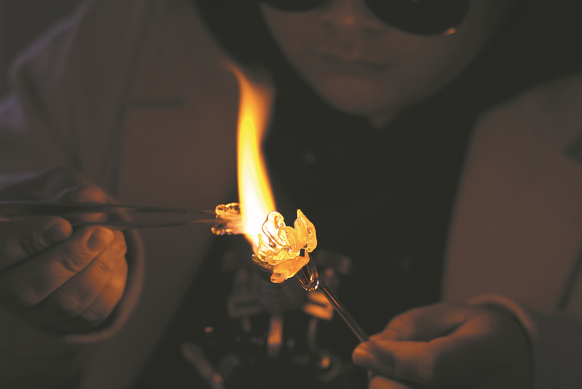 Tourists experience the process of glass production in Yanshen Ancient Town on Jan 23.[Photo by Wang Jing/China Daily]