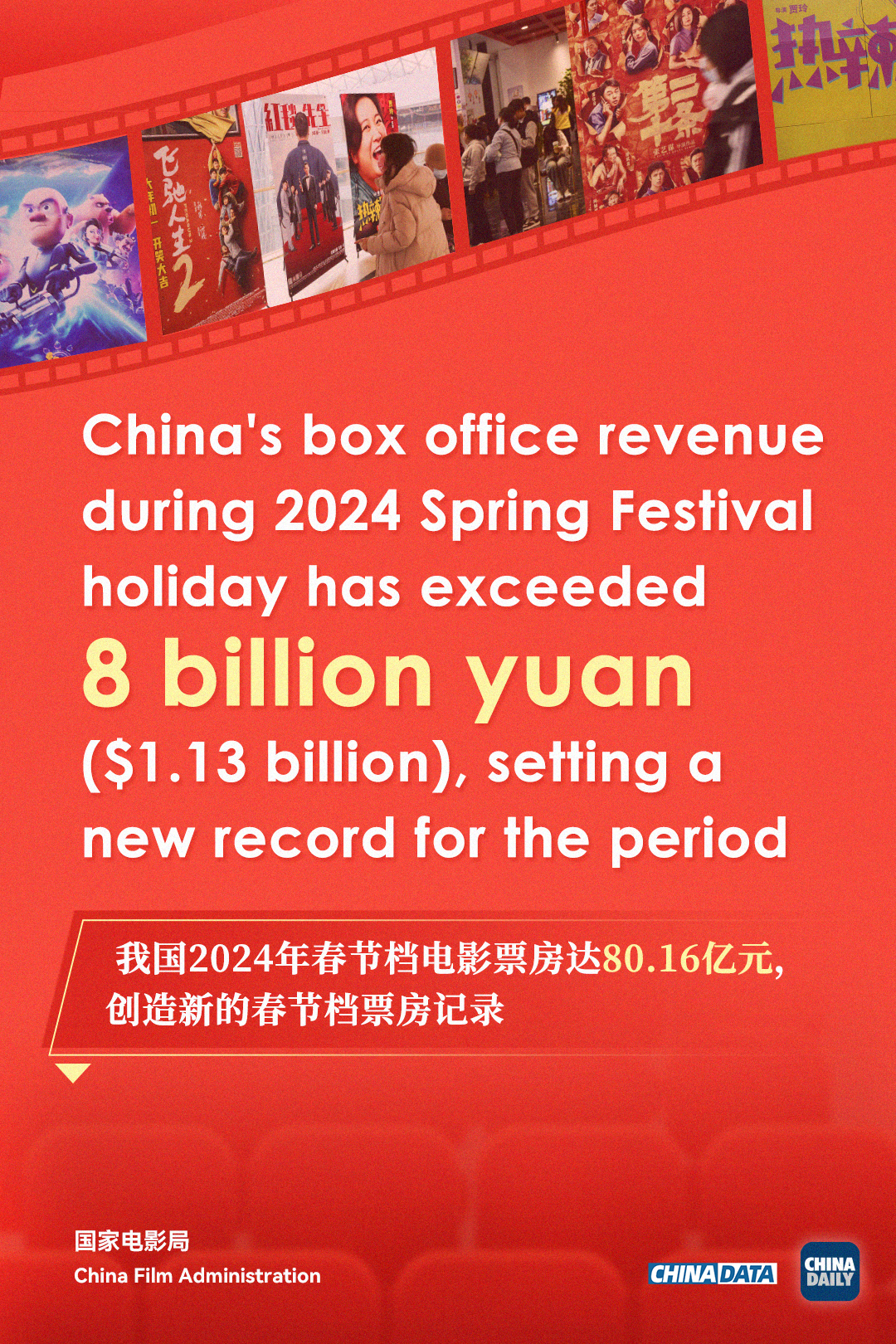 BEIJING -- China's box office revenue during the eight-day Spring Festival holiday through Saturday exceeded 8 billion yuan (about $1.13 billion), with domestic comedy movies accounting for over 97 percent of the total earnings.