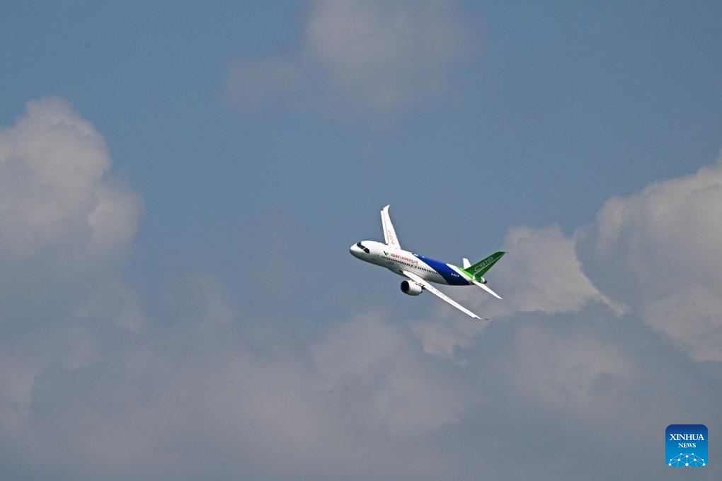 A Chinese passenger jet C919 makes a rehearsal flight to prepare for the upcoming Singapore Airshow in Singapore, Feb 18, 2024. [Photo/Xinhua]
