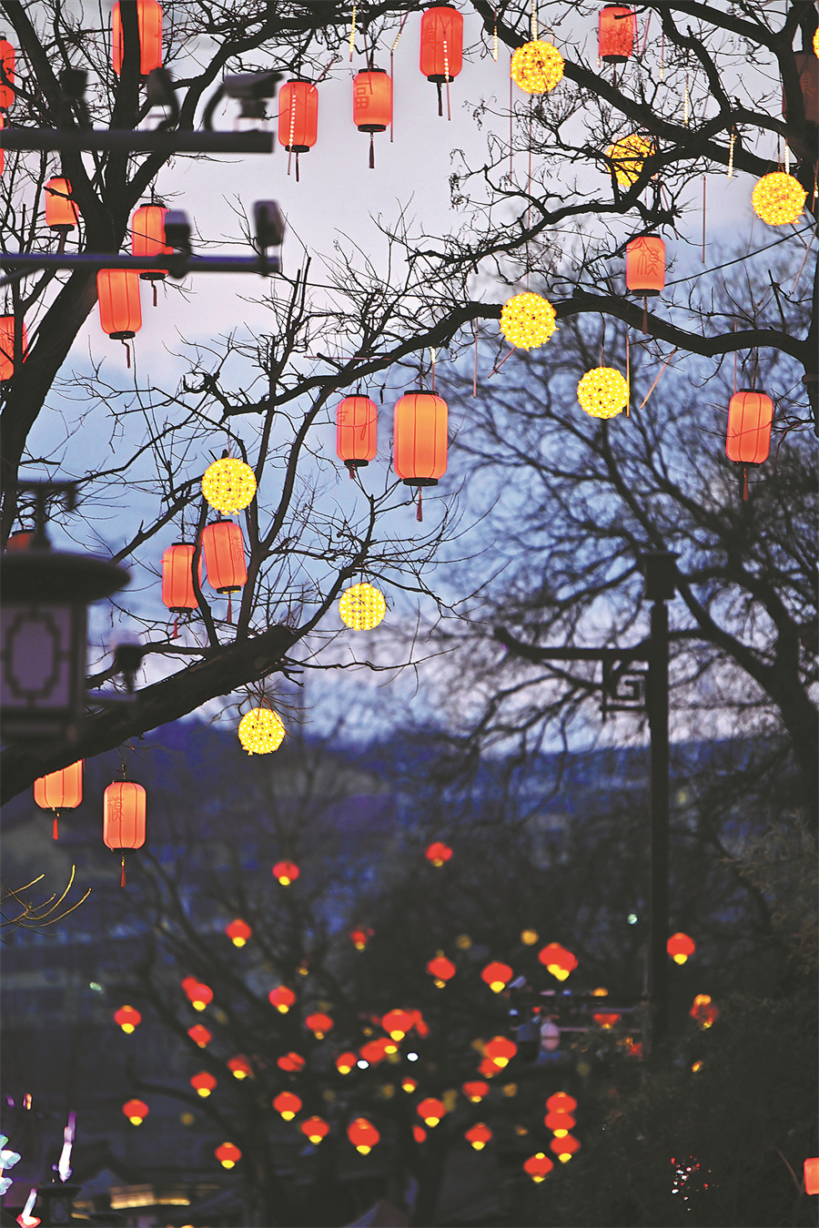 Trees glittering with lanterns form a spectacular scene along the 1,500-meter stretch of Moshikou Street. Stores and stalls on the sides of the road offer culinary treats such as sesame flatbread, mutton soup, sugarcoated haws, and dumplings, adding to the hustle and bustle of the suburban setting.