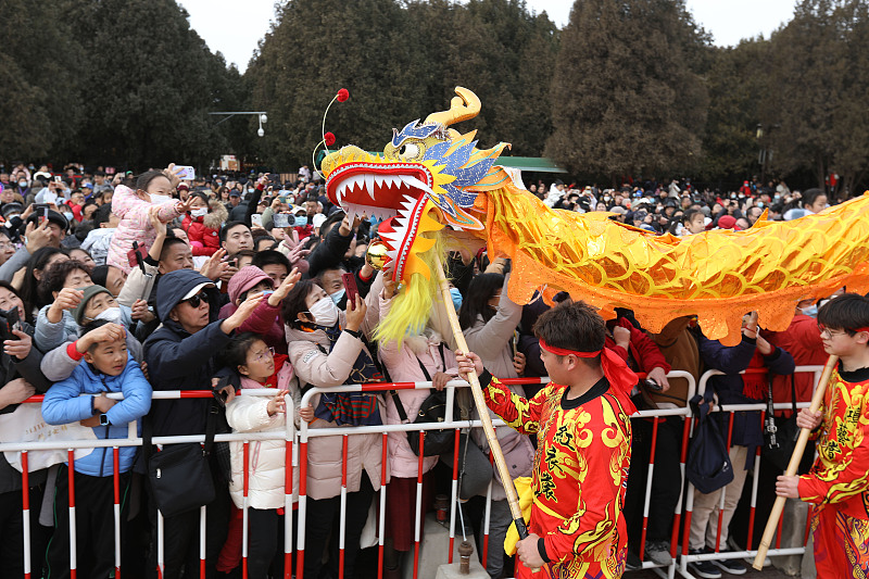 Tourists touch a dragon for good luck during the 36th Ditan Spring Festival Cultural Temple Fair in Beijing on Feb 14, 2024. [Photo/VCG]