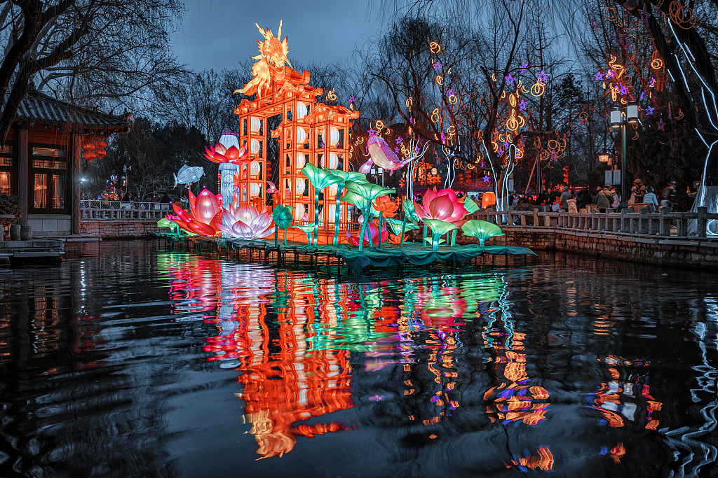 Lanterns designed as lotus are pictured at Baotu Spring Park in Jinan, Shandong province on Feb 19, 2024. [Photo/VCG]