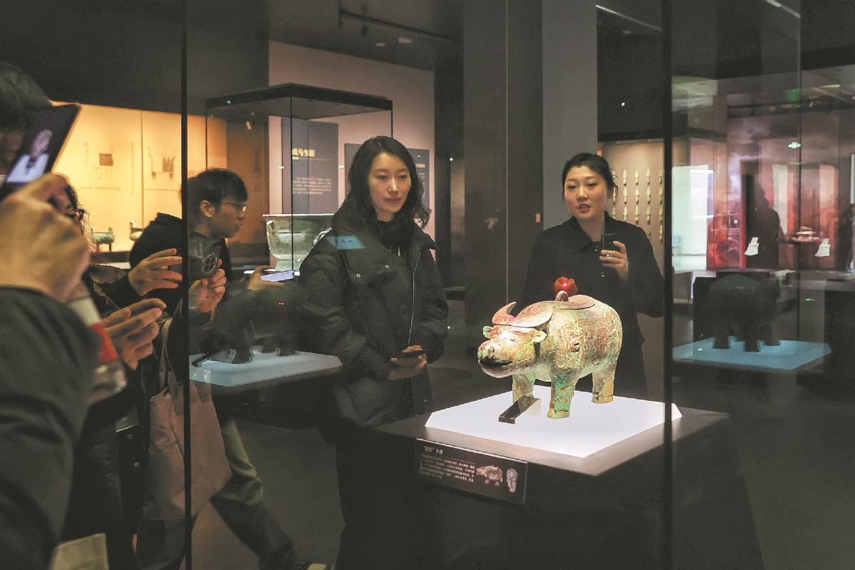 Visitors admire a bronze figurine on display at the new building of the Yinxu Museum, which opened to the public on Monday, in Anyang, Henan province. The new building boasts an exhibition area of 22,000 square meters, where nearly 4,000 cultural relics, including bronzeware, pottery and jade objects, are on display. The expanded museum is the first national archaeological museum to comprehensively present the civilization of the Shang Dynasty (1600 BC-1046 BC). The museum's old building was built in 2005. JIANG DONG/CHINA DAILY