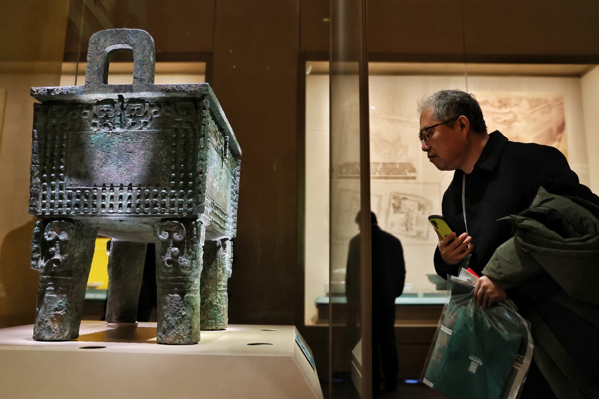 A visitor admires a bronze figurine on display at the new building of the Yinxu Museum, which opened to the public on Monday, in Anyang, Henan province. JIANG DONG/CHINA DAILY