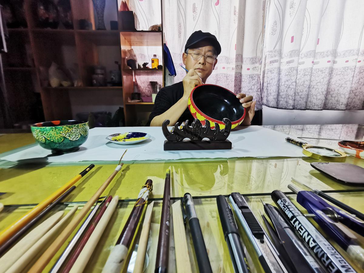 Inheritor Gao Guangyou makes Dafang lacquerware at his workshop in Dafang county, Guizhou province. [Photo by Peng Youlin/provided to chinadaily.com.cn]