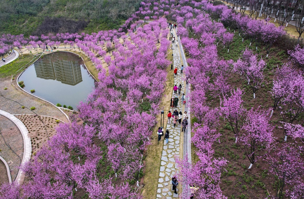 Over 1,600 blooming plum blossoms at Tiaodunhe Park in Chongqing's Liangjiang New Area have created a breathtaking pink flower sea, resembling butterflies with their vibrant colors. This picturesque sight has drawn a large number of visitors.