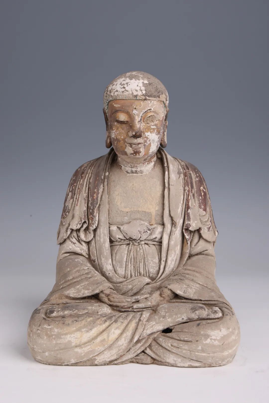 Behold this Ming Dynasty (1368-1644) clay sculpture of the seated Buddha with a coiled topknot. His round face features delicate eyebrows, slightly-closed eyes and a gently smiling expression, with elongated earlobes. Clad in a flowing kasaya, the Buddha is adorned with red paints, despite many of them having faded over time. Collection: China Museum for Fujian-Taiwan Kinship.