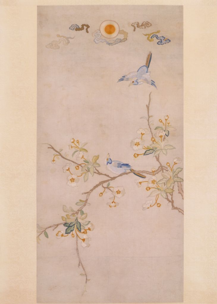 Captured on this exquisite embroidered scroll, the radiant sun shines down on blossoming crabapple flowers. A bird perches at ease on a branch, while another descends from the sky, drawn to join its companion.