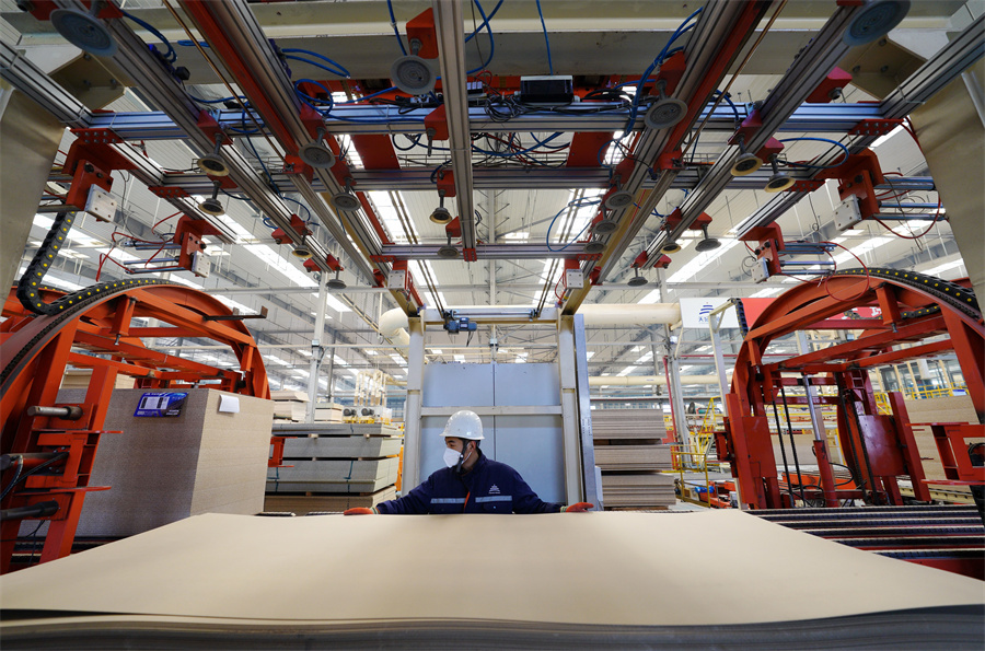 A staff member works at a wood production workshop in Caofeidian district, Tangshan city, North China's Hebei province, March 1, 2024. [Photo/Xinhua]