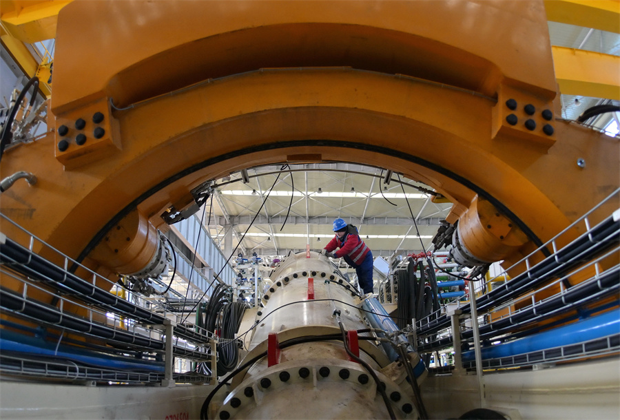 A staff member works at a shield tunneling machine production workshop in Caofeidian district, Tangshan city, North China's Hebei province, March 1, 2024. [Photo/Xinhua]