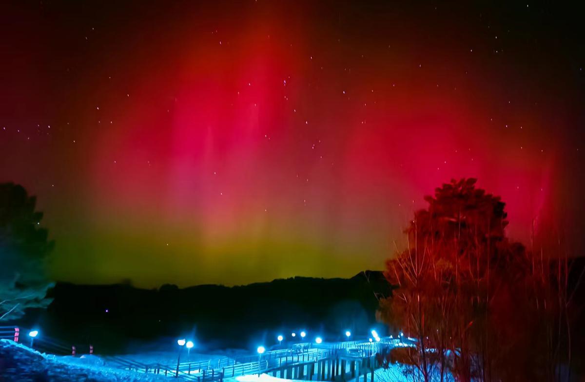 The aurora, mainly colored red and green, ripple alternately across the night sky at high latitudes, attracting visitors along the frozen banks of the Heilongjiang River to capture the moment with their mobile phones.