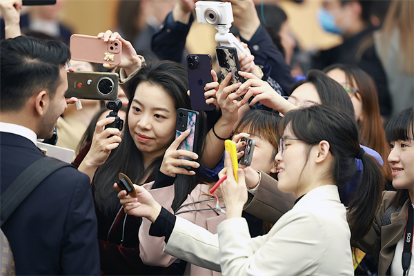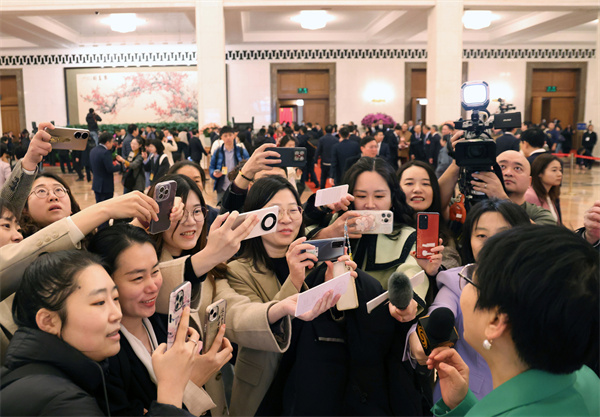 Women journalists interview a CPPCC National Committee member ahead of the second plenary meeting of the second session of the 14th National Committee of the Chinese People's Political Consultative Conference in Beijing on March 7, 2024. [Photo by Wang Jing/chinadaily.com.cn]
