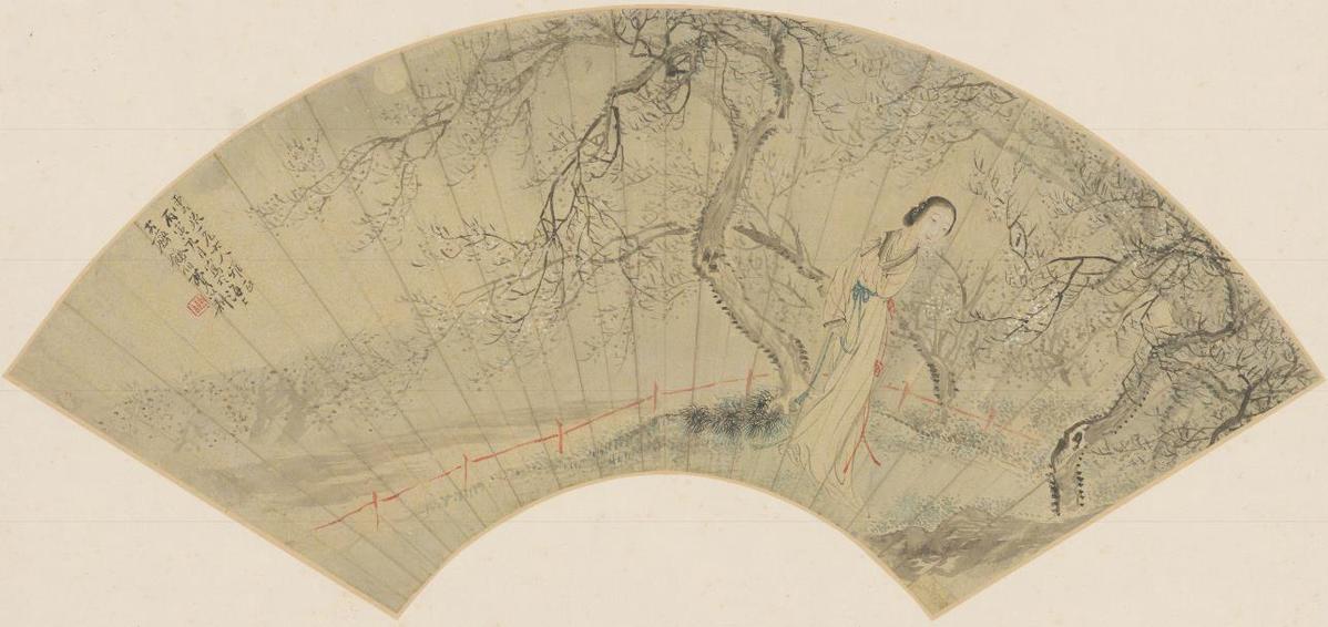 In a peaceful early spring, plum blossoms gracefully adorn branches, creating a tranquil scene for the solitary and beautiful woman to admire. This is an exquisite fan painting from Qing Dynasty (1644-1911) artist Fei Yigeng, housed by the Palace Museum in Beijing.