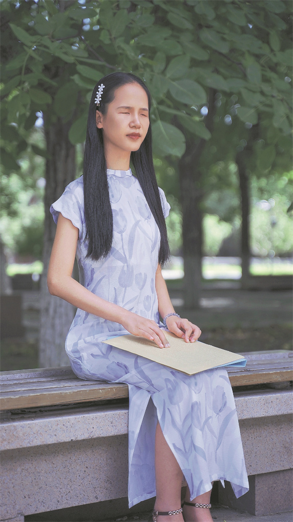 Dong Lina reads a Braille book on the campus of the Communication University of China in Beijing. [Photo provided to chinadaily.com.cn]