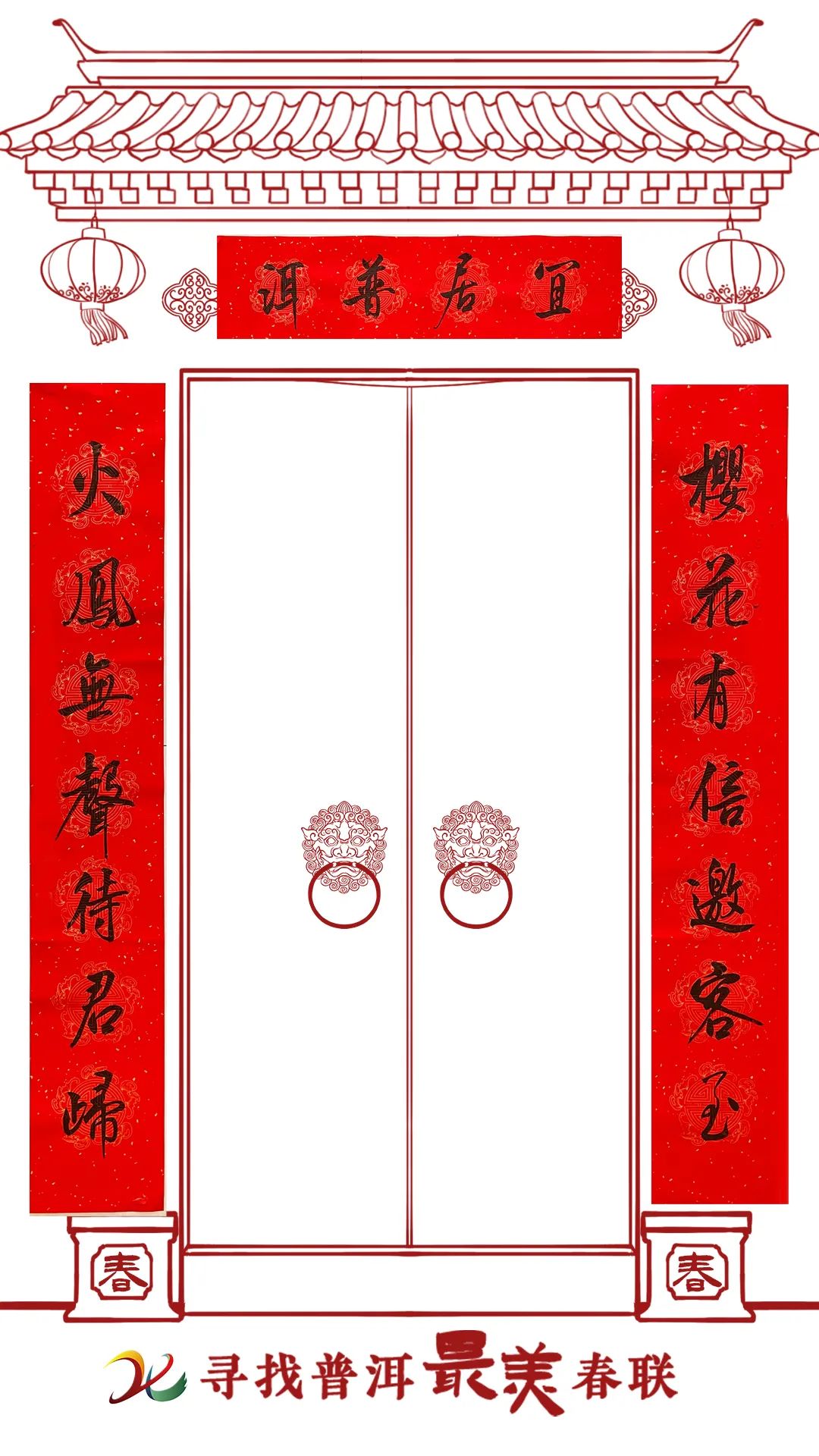 Embark on a journey to Pu’er, where nature’s allure is vividly captured in this Spring Festival couplet written by Zhao Chenglin and Cheng Xianmei. Its first line, “樱花有信邀客至”, means “Cherry blossoms extend an invitation, luring guests from afar”. The second line, “火凤无声待君归”, reads “the flame-like red phoenix flower silently awaits your return”. The horizontal scroll is “宜居普洱” (Liveable Pu’er). Written in semi-cursive script, each stroke of the couplet weaves a tale of the city’s natural splendor, inviting travelers to immerse themselves in the tranquility and picturesque charm of Pu’er.