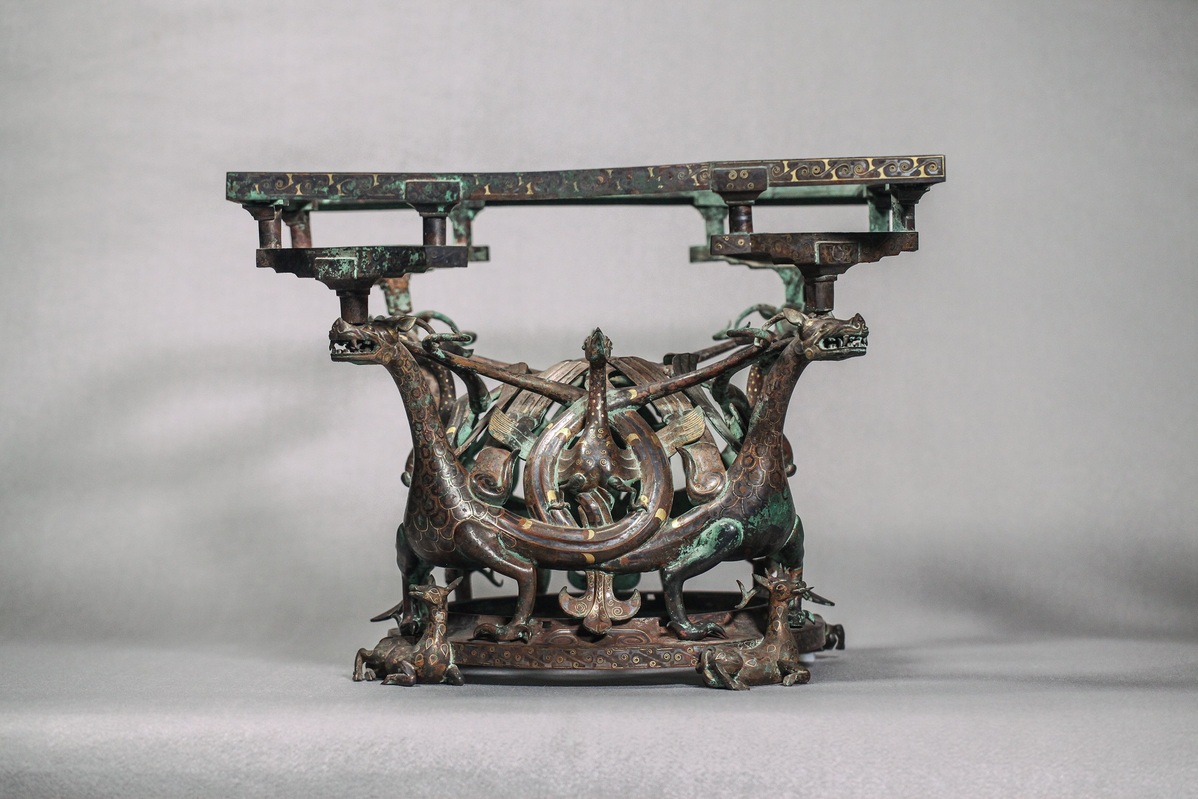 The photo shows Bronze Square Table Stand Decorated with Dragon-and-phoenix, one of the exhibited relics at Hebei Museum, in Shijiazhuang, Hebei province. [Photo provided to chinadaily.com.cn]