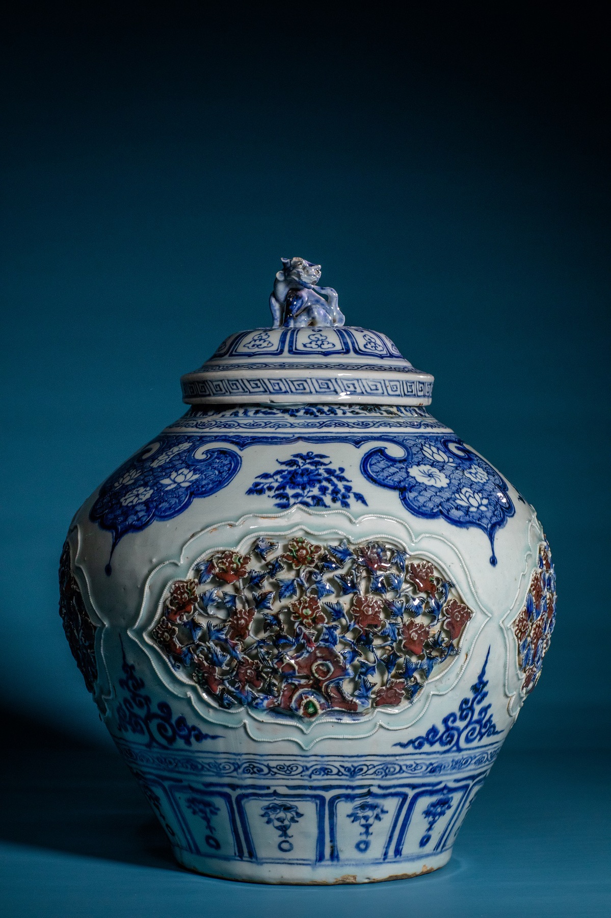 The photo shows Blue-and-white Porcelain Lidded Jar with Underglaze Red Design and Repousse Floral Medallion Design, one of the exhibited relics at Hebei Museum, in Shijiazhuang, Hebei province. [Photo provided to chinadaily.com.cn]