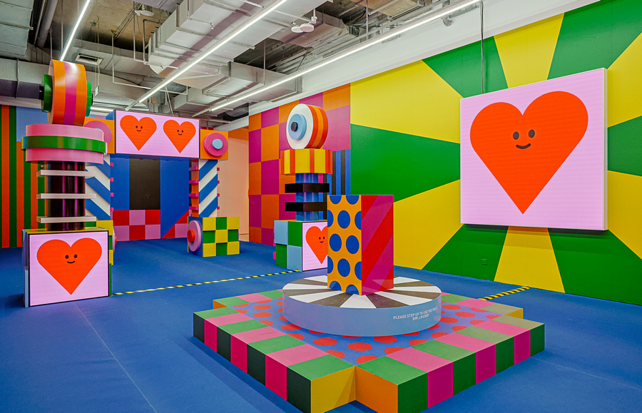 For example, at Zoom Out, Chinese audiences may be greeted with a sense of familiarity as they gaze at the colorful sculptures of simple shapes—round, square and rectangular. Two forms in traditional Chinese architecture, paifang, or memorial archway gates and stone columns, are featured in this courtyard-esque space.