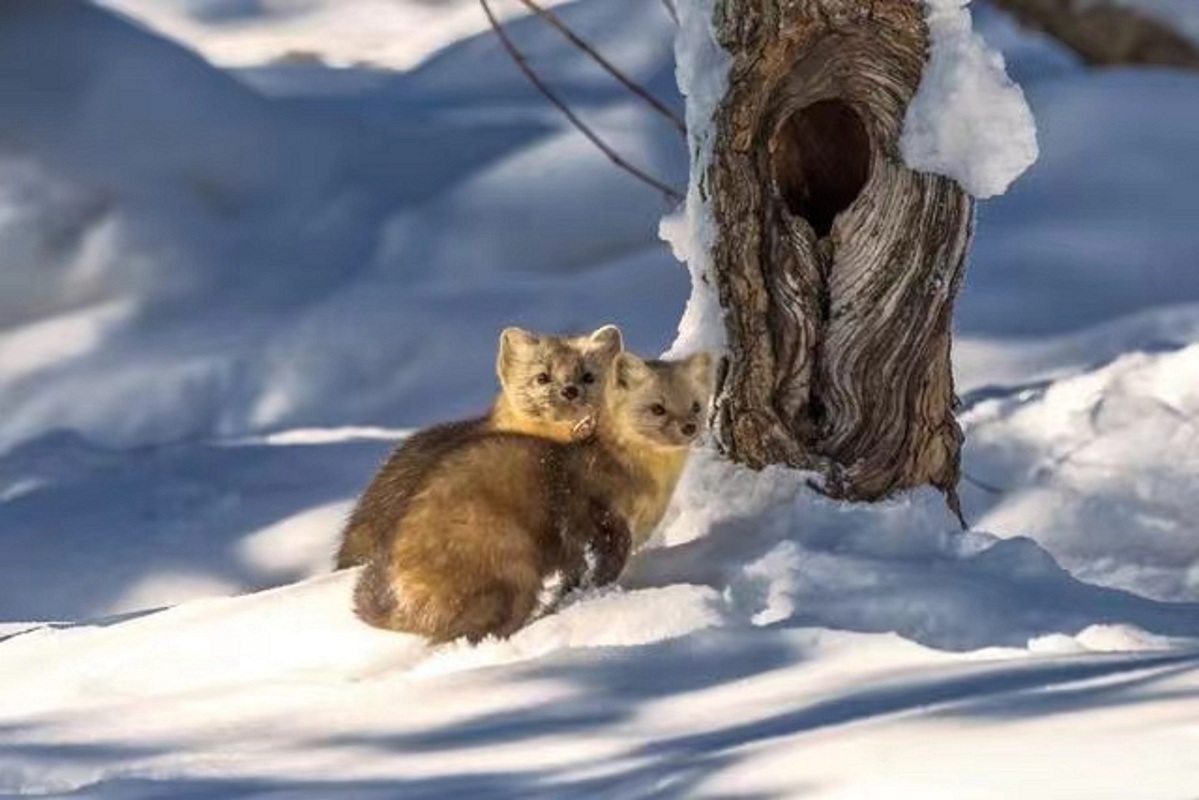 Two wild sables stand in deep snow near Laolike Lake in Yanbian Korean autonomous prefecture, Jilin province. [Photo provided to chinadaily.com.cn]
