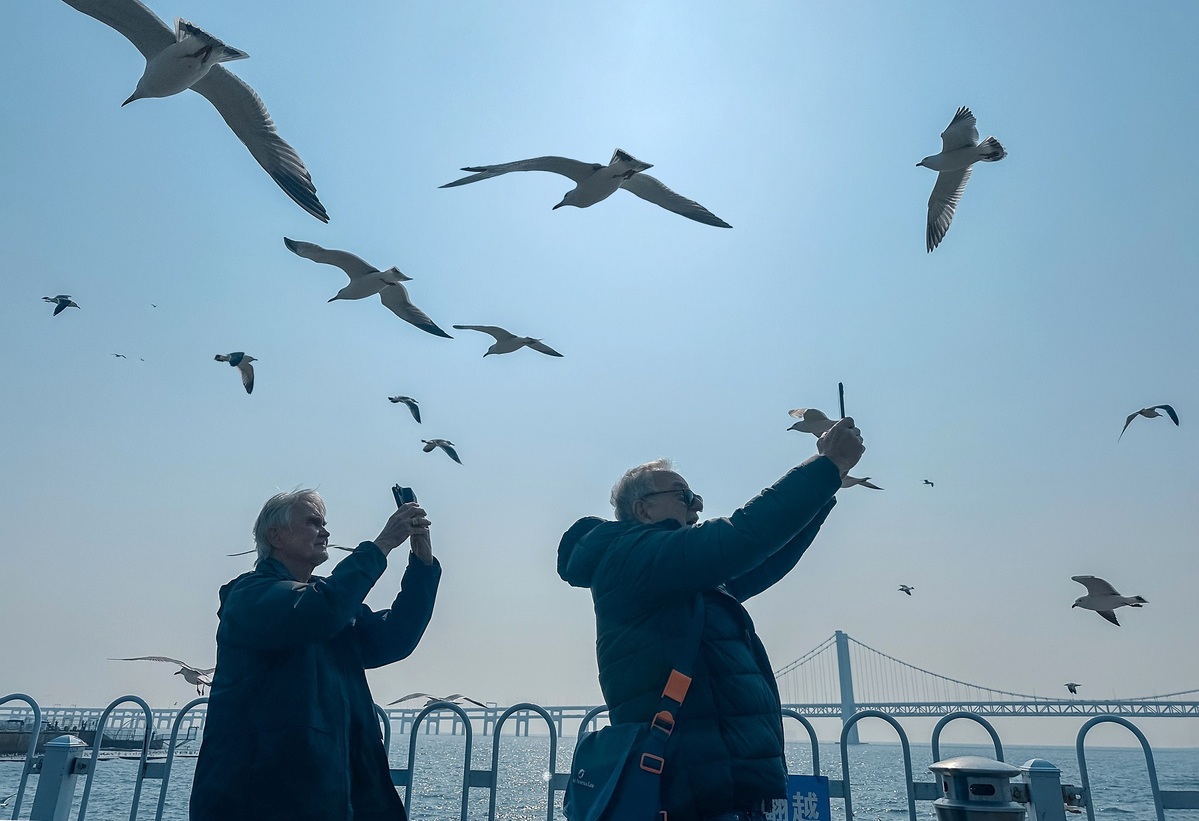 International tourists take pictures of the seagulls in Dalian, Liaoning province, on Sunday. [Photo by Zhong Qigang/For chinadaily.com.cn]