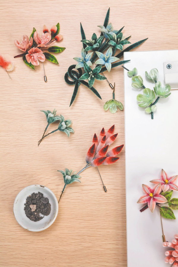 His colorful silk flowers are popular with young women who have turned them into a new urban trend and share pictures on social networks. The undying floral ornaments have also featured in popular period dramas, on red carpet outfits, at fashion shows and in the new collections of luxury brands.