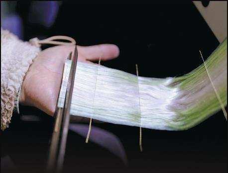 To make a velvet flower, fine threads of silk are first boiled to be softened, then they are dyed, shaped and rolled evenly onto the wire frame. Next, the velvet sticks are trimmed into different shapes, and twisted to create the design that has been ordered.