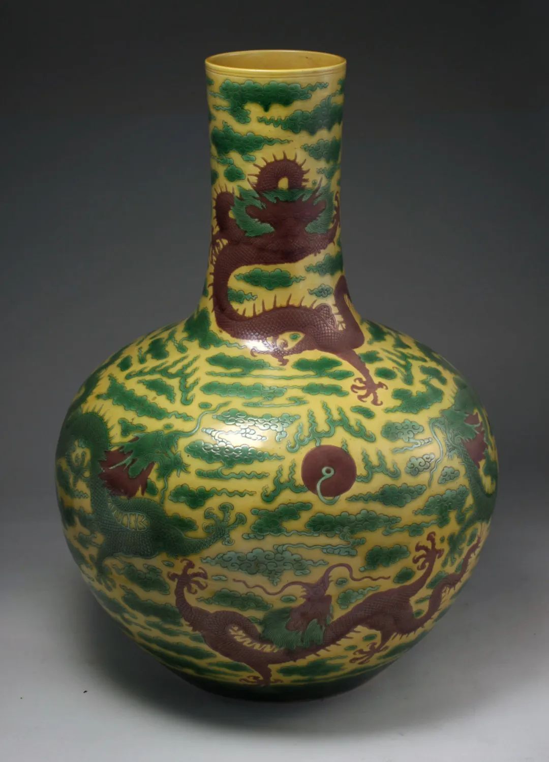 Yellow-glazed vase with green and purple motifs of dragons and clouds, Kangxi reign of the Qing Dynasty [Photo/Official WeChat account of the Shandong Museum]