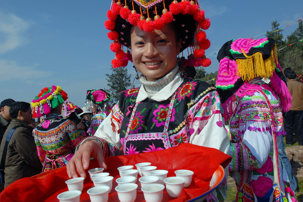 Chahua Festival is a distinctive traditional festival of the Yi people, and is especially grand in Dayao county of Chuxiong prefecture, Yunnan province. It has been honored with such titles as "the Most Distinctive Ethnic Festival", “the Most Distinctive Tourism Festival” and “One of the World's 100 Traditional Minority Festivals”. Every year on the eighth day of the second lunar month, local Yi people adorn their doorways, agricultural tools, as well as on each other's hair and clothing with horse-tail flowers (Rhododendron delavayi Franch) they pick from the mountains. People dress in festive attire and gather in the mountains to worship flower gods, pray, sing, and dance.
