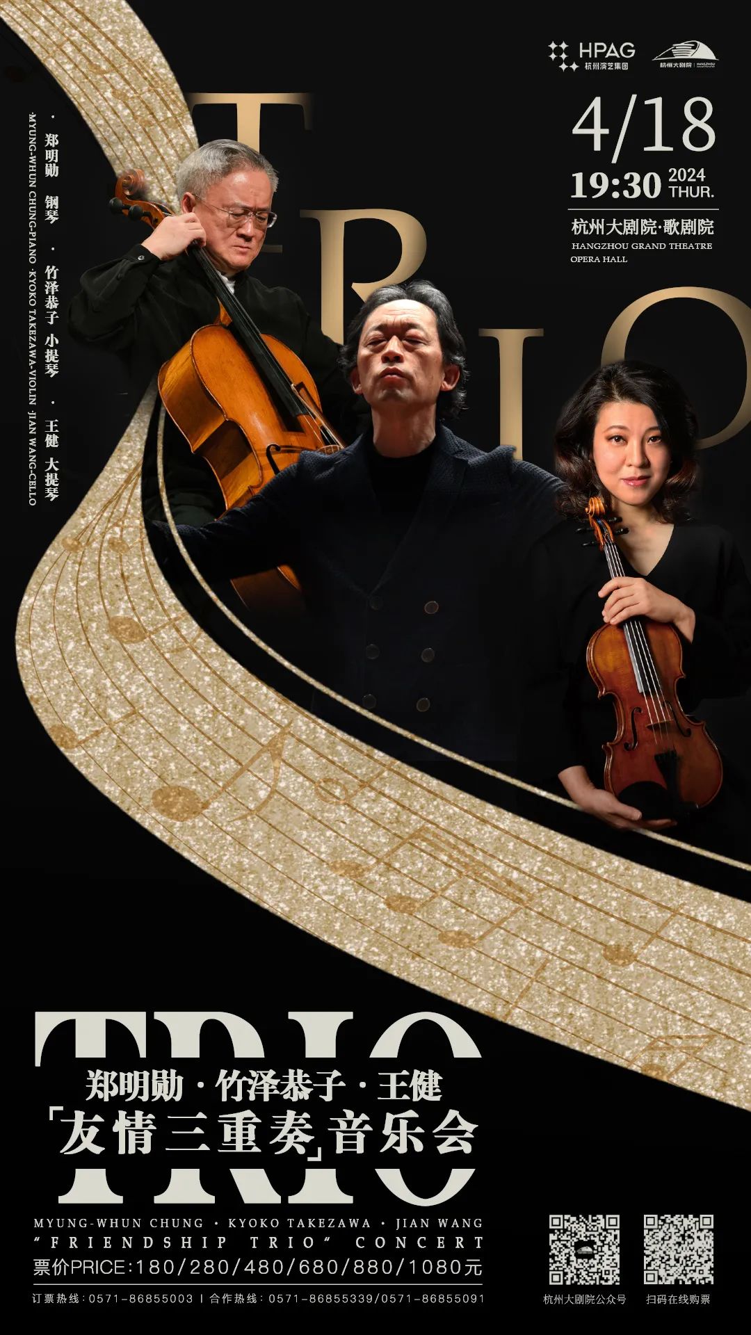 Let’s step into a world of musical mastery on April 18 at the Hangzhou Grand Theater! You will witness a once-in-a-lifetime convergence of talent, as three world-renowned maestros - cellist Wang Jian, violinist Kyoko Takezawa, and conductor/pianist Chung Myung-Whun - come together to interpret timeless classics by Tchaikovsky and Brahms. Don't miss this enchanting night of harmonious brilliance!