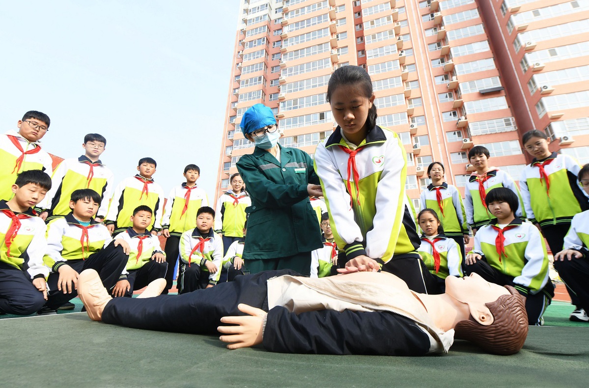 Students learn emergency rescue methods under the guidance of a doctor in Shijiazhuang, North China's Hebei province on March 25, 2024, China's national safety education day for middle and primary school students. [Photo by Jia Minjie/For chinadaily.com.cn]