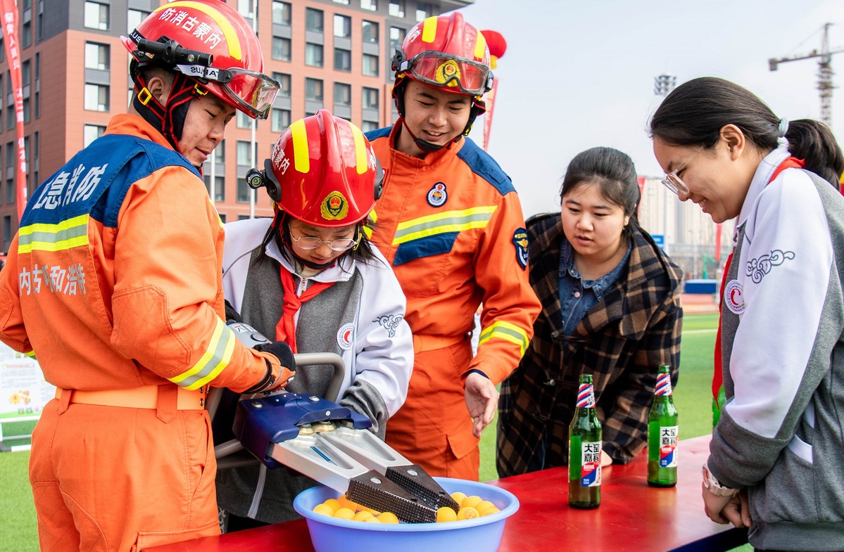 A student experiences firefighting equipment at a ceremony launched in Hohhot, North China's Inner Mongolia autonomous region on March 25, 2024, China's national safety education day for middle and primary school students. [Photo by Ding Genhou/For chinadaily.com.cn]