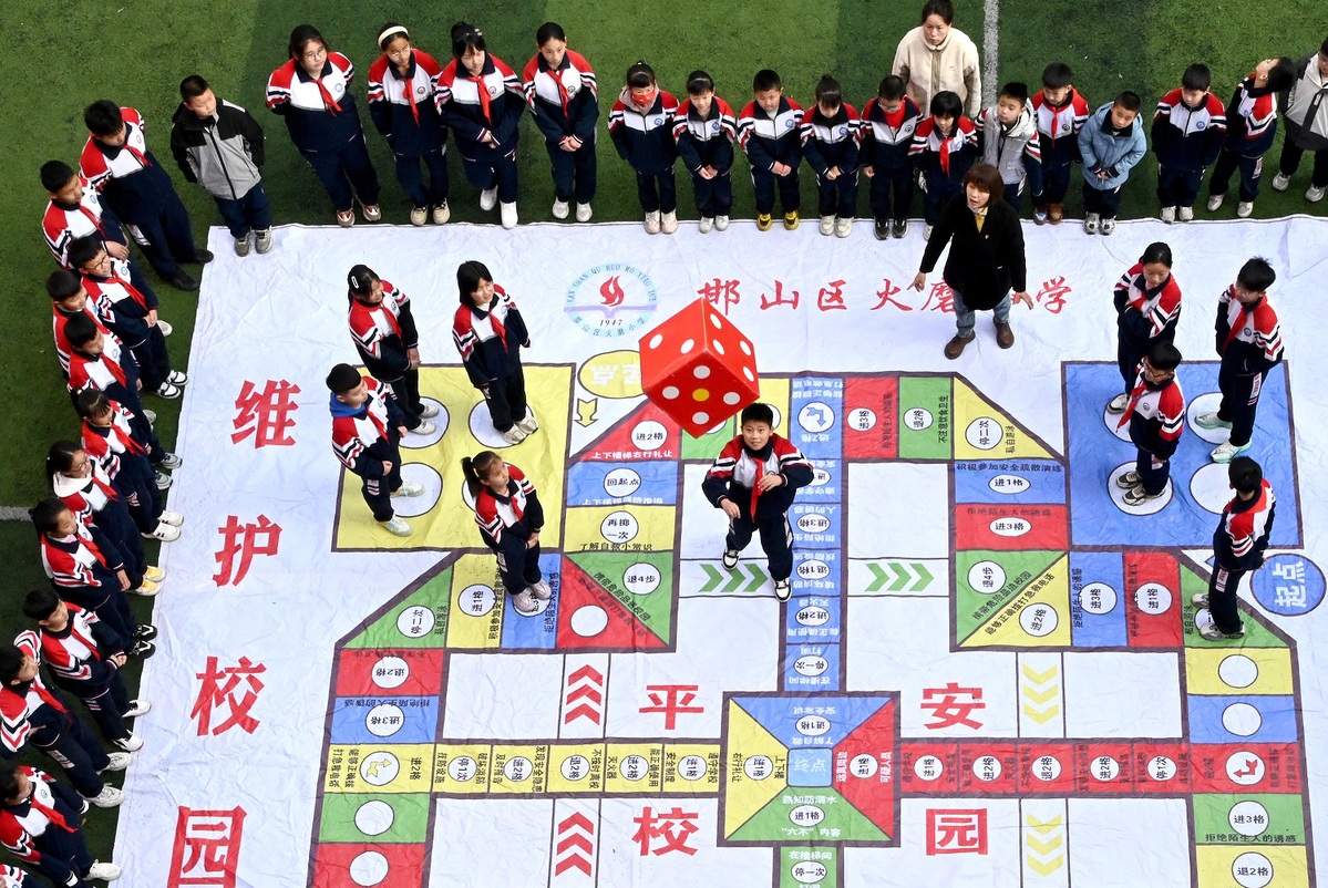 Students take part in a game for traffic safety signs at a primary school in Hanshan district of Handan, North China's Hebei province on March 25, 2024, China's national safety education day for middle and primary school students. [Photo by Hao Qunying/For chinadaily.com.cn]