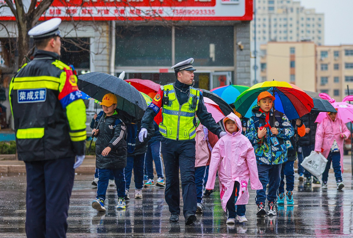 Policemen escort students across the road at Rongcheng, East China's Shandong province on March 25, 2024, China's national safety education day for middle and primary school students. [Photo by Li Xinjun/For chinadaily.com.cn]