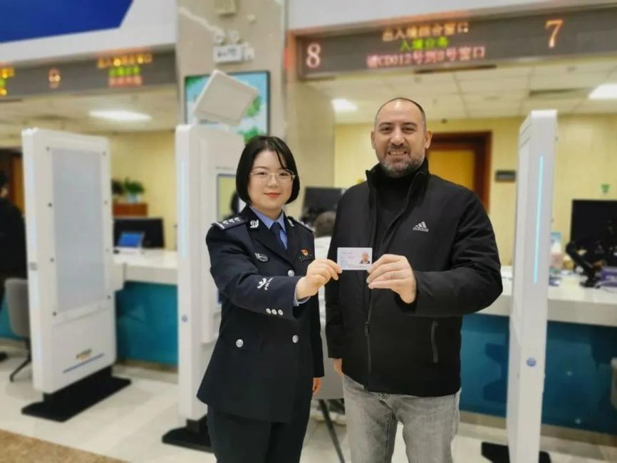 Turkish national Yildirim Burhan expressed gratitude in Chinese to the Exit-Entry Administration of the Yinchuan Public Security Bureau in the Ningxia Hui autonomous region on Friday after being awarded a five-star card, the latest permanent resident identity card for foreigners.