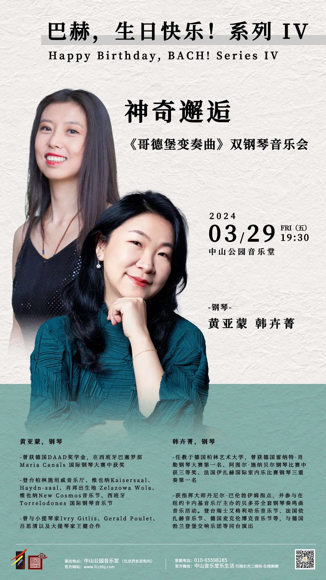 Join us at the Forbidden City Concert Hall in Beijing on March 29 at 19:30 for the national premiere of the Goldberg Variationsfor two pianos! Witness the debut collaboration between pianists Huang Yameng and Han Huijing. Don't miss this extraordinary performance in celebration of Bach's birthday!