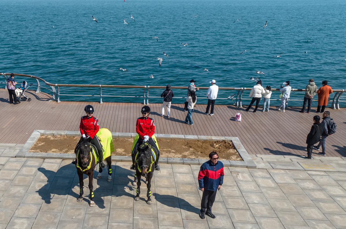 Female horseback police are patrolling at the Gangdongwu Street in Dalian, Liaoning province. [Photo by Li Xuejin/for chinadaily.com.cn]