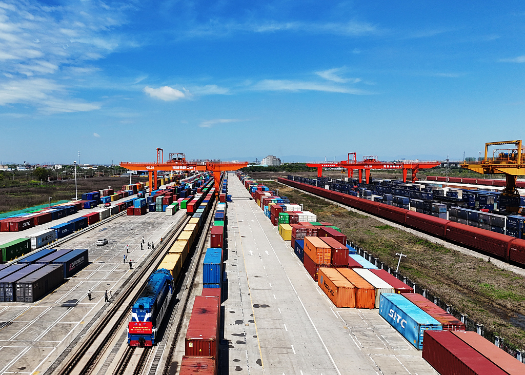 A freight train loaded with merchandise departs from Nanchang International Land Port, East China's Jiangxi province, destined for the five Central Asian countries, on March 31, 2024. [Photo/VCG]