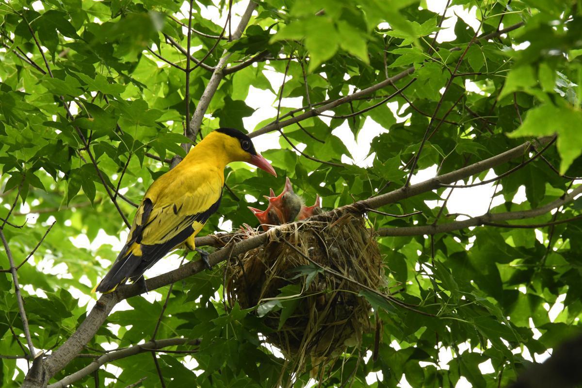 Photo shows an oriole feeding its babies at the Changbai Mountain Nature Reserve in Northeast China's Jilin province. [Photo provided to chinadaily.com.cn]