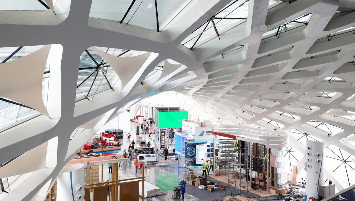 Workers carry out decoration work at the Hainan International Convention and Exhibition Center in Haikou, Hainan province, April 8, 2024. [Photo/Xinhua]