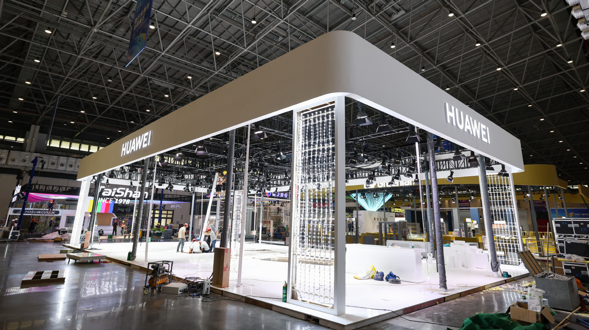 Workers carry out decoration work inside a Huawei booth for the fourth China International Consumer Products Expo, at Hainan International Convention and Exhibition Center in Haikou, Hainan province, April 8, 2024. [Photo/Xinhua]
