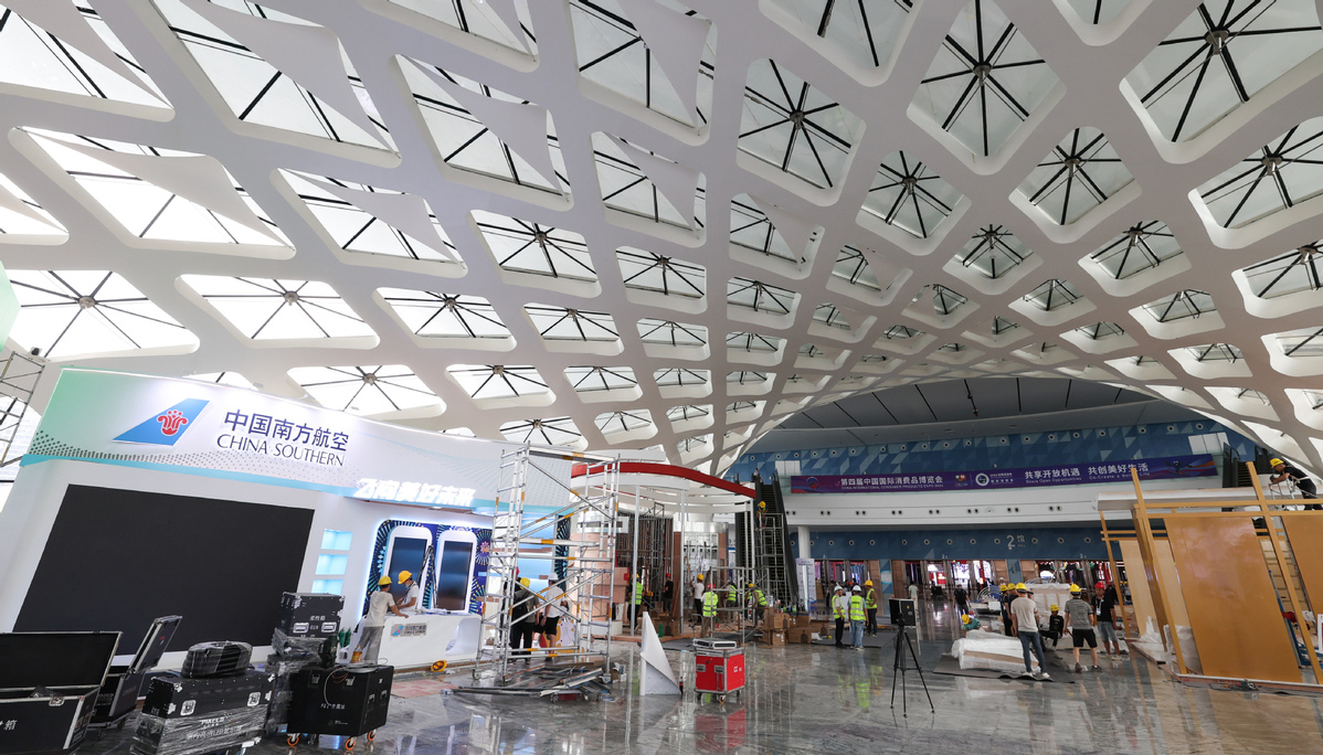 Workers carry out decoration work at the Hainan International Convention and Exhibition Center in Haikou, Hainan province, April 8, 2024. [Photo/Xinhua]