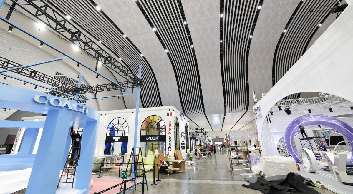 Workers carry out decoration work at the Hainan International Convention and Exhibition Center in Haikou, Hainan province, April 8, 2024. [Photo/Xinhua]
