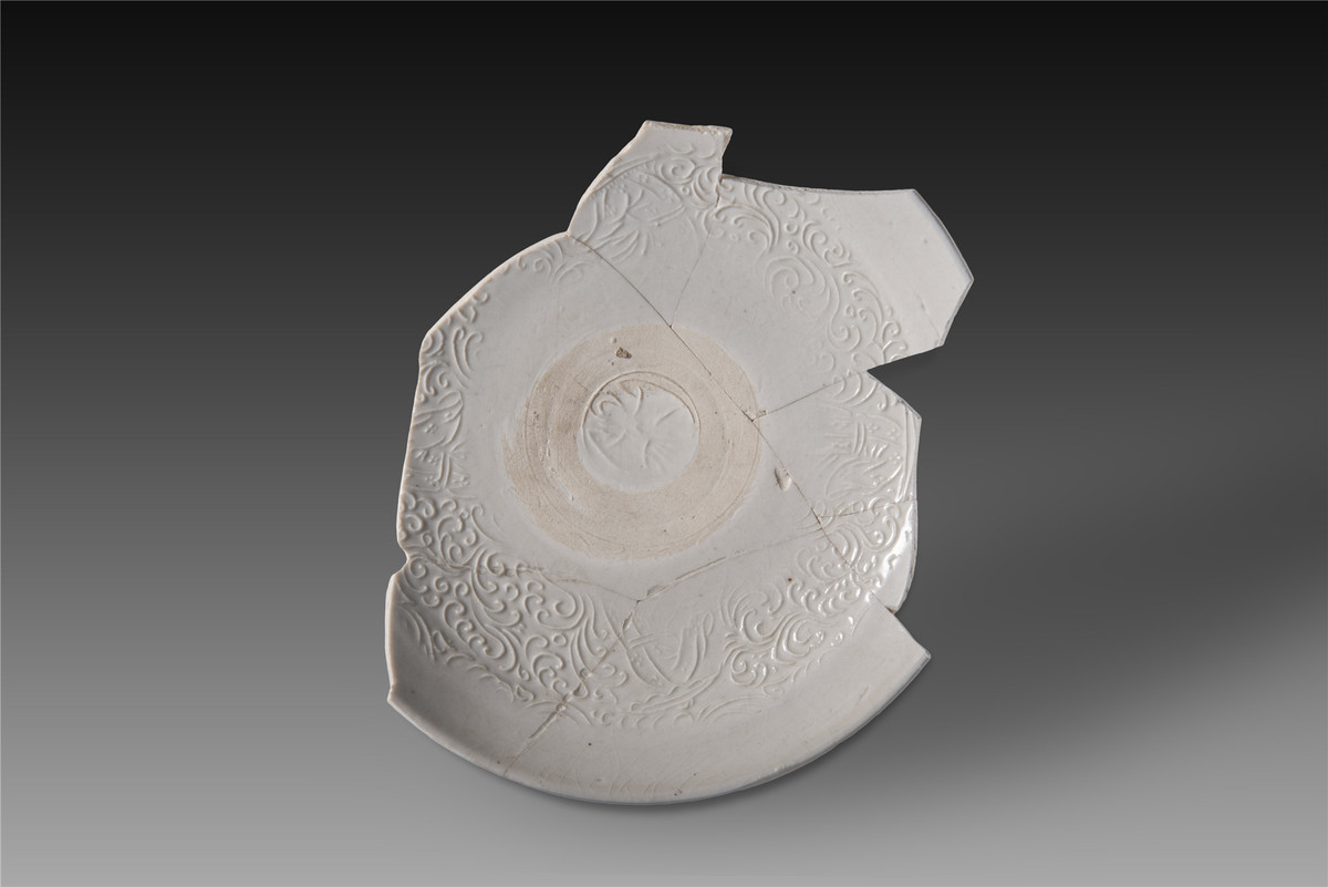Shard of a fine white porcelain plate with ripple and figure motif in an unglazed foot, Jurchen Jin Dynasty (1115-1234)
